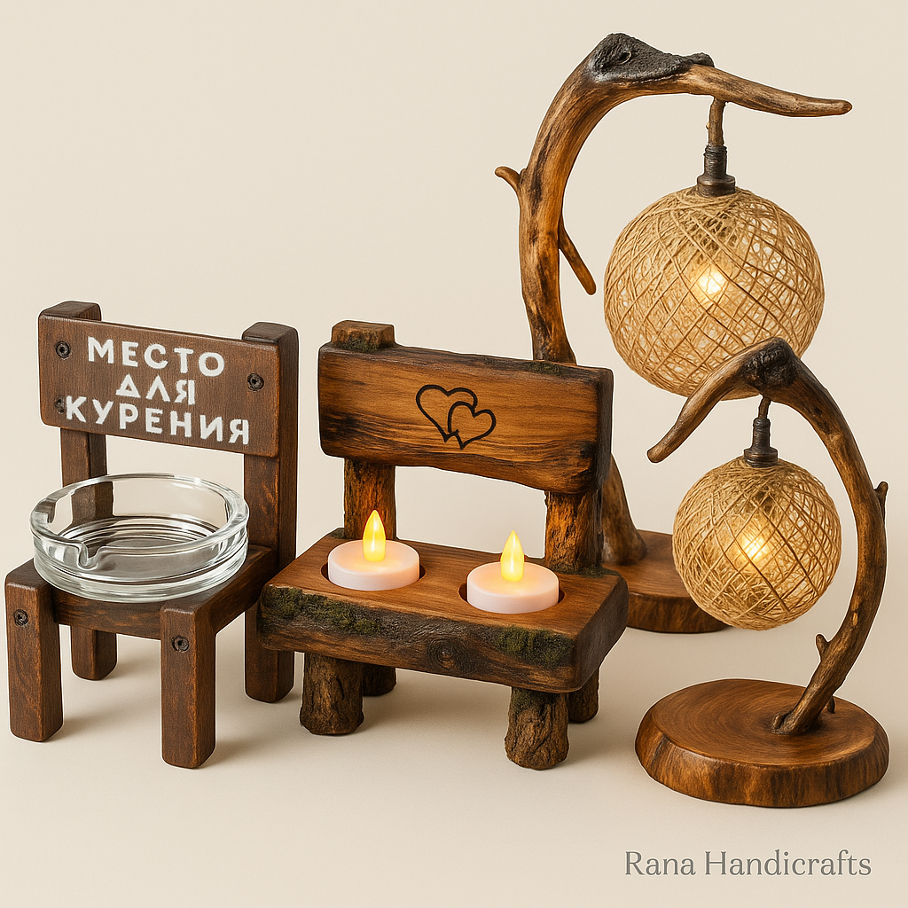 ست دکور هنری دست‌ساز از چوب طبیعی با طراحی منحصر‌به‌فرد، شامل چراغ رومیزی با شید حصیری و جاشمعی طرح نیمکت؛ مناسب برای دکور گرم و صمیمی خانه یا کافه.