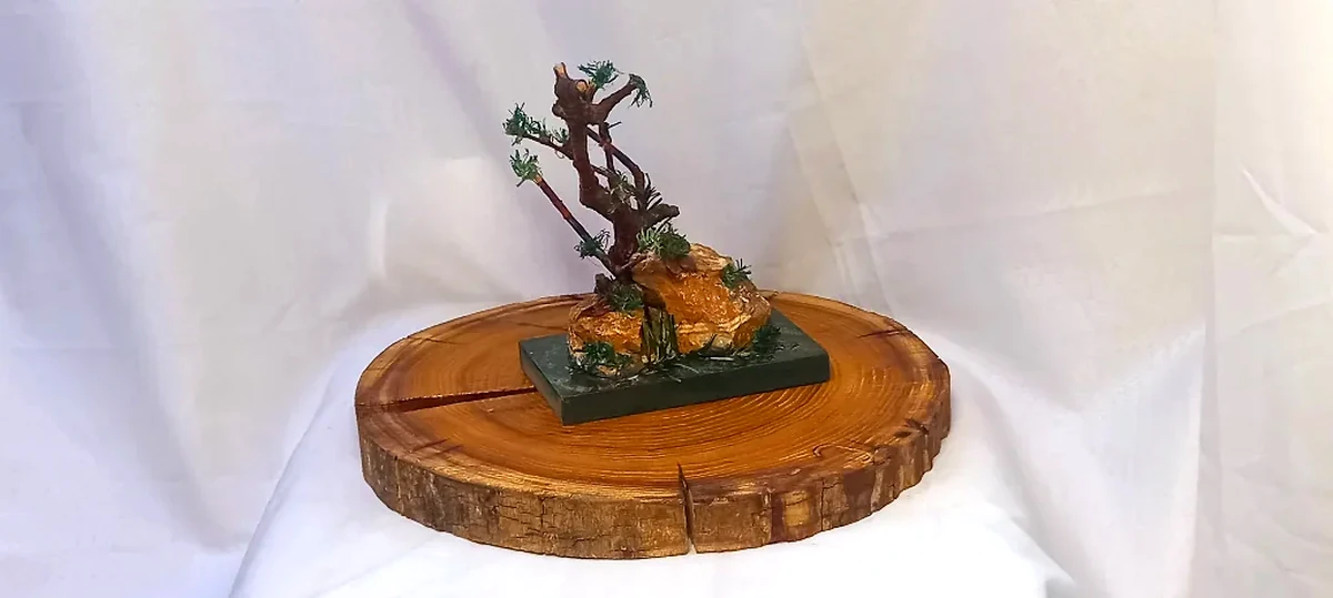 درختچه مینیاتوری روحبخشریشههایش بر سنگهای طبیعی استوار شده، تنه و شاخههایش از چوب گیلاس گرم و دلنشین تراشیده شده، و برگهایش با سبزه مصنوعی ظریف، سبزی همیشهبهار را به خانه میآورد.این اثر، تلفیقی از اصالت طبیعت و دوام هنر دست است؛ سنگ، نماد استقامت… چوب گیلاس، نماد مهربانی… و سبزه همیشهسبز، نماد زندگی و امید جاودان.