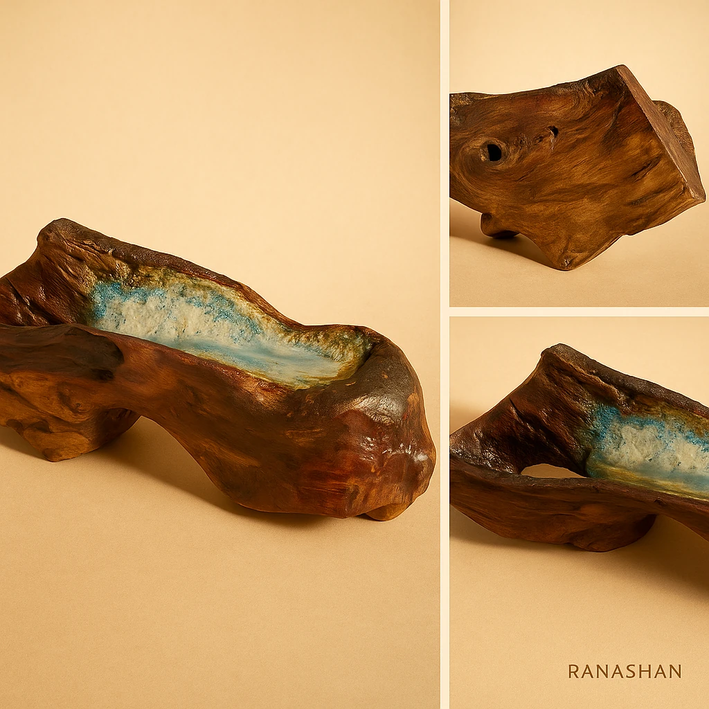 ترکیب جانِ درخت با روحِ دریا؛ ظرفی از چوب طبیعی و رزین آبی که حس موج و آرامش را به خانهات میآورد.