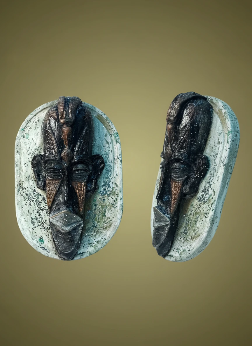 تابلوی دکوراتیو دیواری از جنس سنگ مصنوعی با روکش ضدآب لعاب سرد، طرح چهرهی انتزاعی قبیلهای روی پسزمینهی بافتدار الهامگرفته از جنگل و باران؛ مناسب فضاهای هنری و خاصپسند.