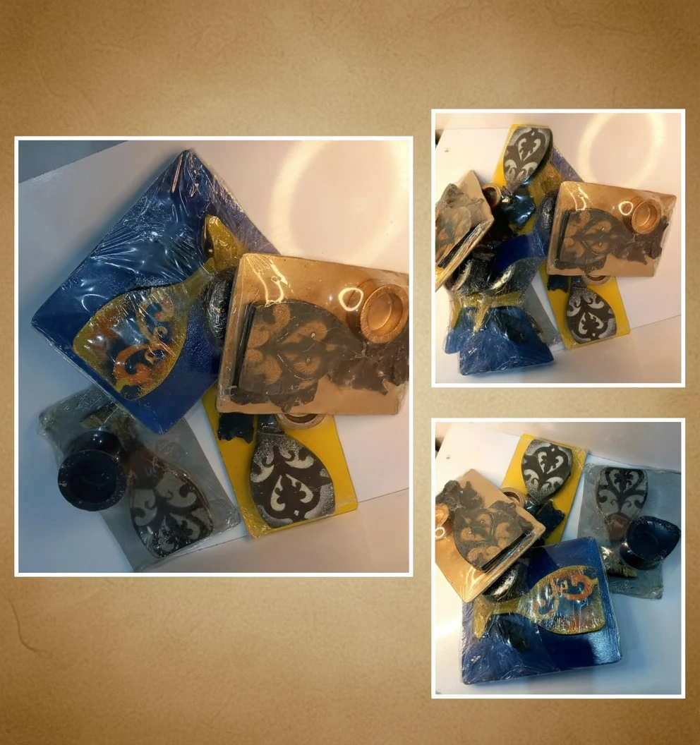 ست جاشمعی دیواری دستساز از سنگ مصنوعی با کفی چوبی، در رنگهای آبی، طلایی، زرد و طوسی طرحدار؛ مناسب دکور مدرن و کلاسیک، برای جان دادن به دیوارهای خالی و ایجاد نور گرم شمع در فضا.