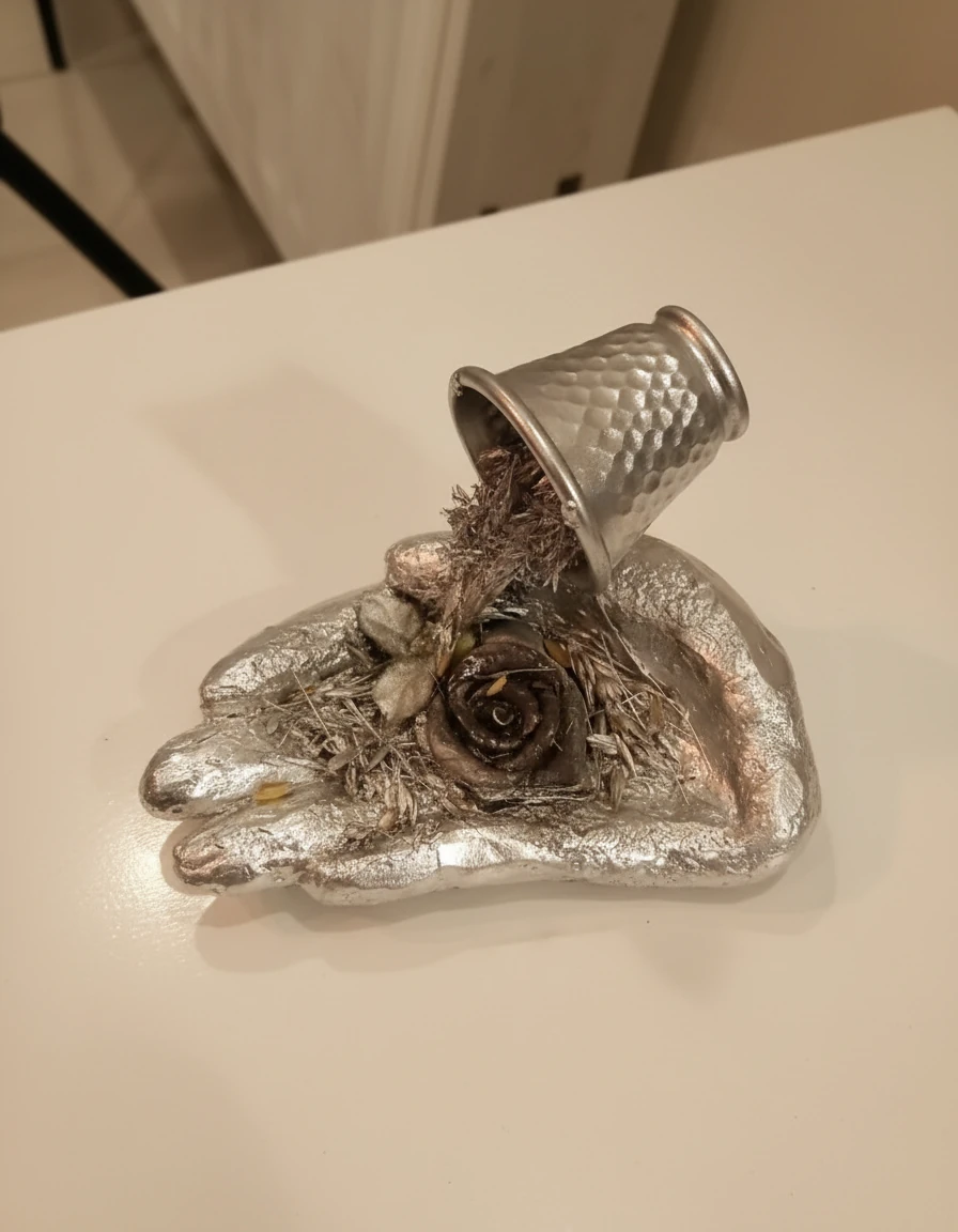 مجسمه دست نقرهای که از دل آن گل رز و خوشههای نقرهای میروید و فنجانی فلزی بالای آن در حال ریزش برکت است؛ یک دکوری مفهومی و خاص برای میز کار، کنسول یا شلف خانه، ساختهشده توسط هنرمندان رناشان.