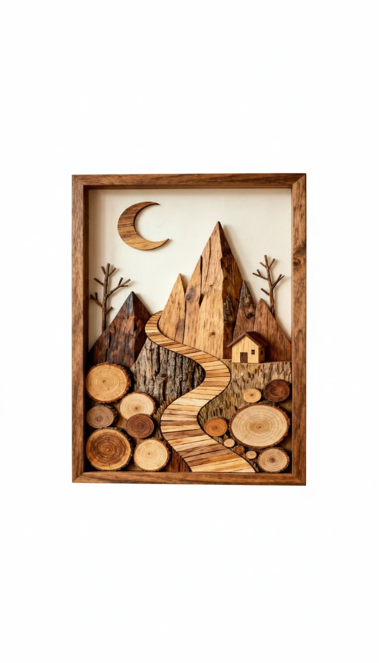 تابلو دیواری چوبی دستساز با طرح کوه، ماه و کلبهی کوچک؛ ساخته شده از چوبهای طبیعی با بافتهای واقعی. مناسب برای دکور گرم و طبیعتدوست.