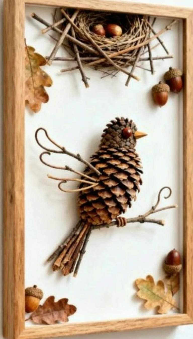 تابلو دیواری دستساز با پرندهی جنگلی ساخته شده از مخروط کاج، شاخه و برگهای طبیعی. دکوری گرم و متفاوت برای عاشقان طبیعت و انرژی زمین.