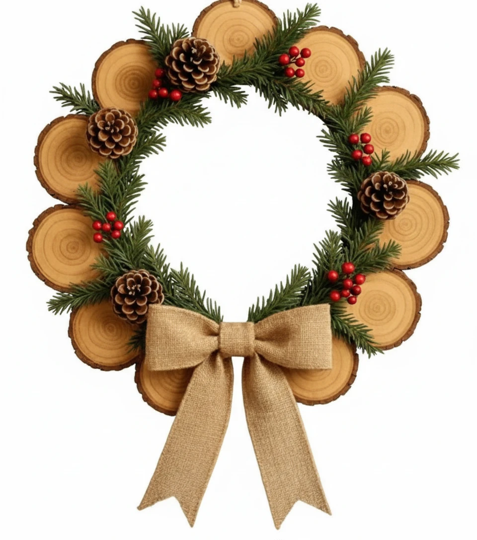 بافت گرم چوب کنار سبزی شاخهها و قرمزی سمرهها، حس جنگل زمستانی و شومینهی روشن رو زنده میکند؛ و روبان کنفی پهن، کار را کامل میکند و به آن حالوهوای روستیک و صمیمی میدهد.