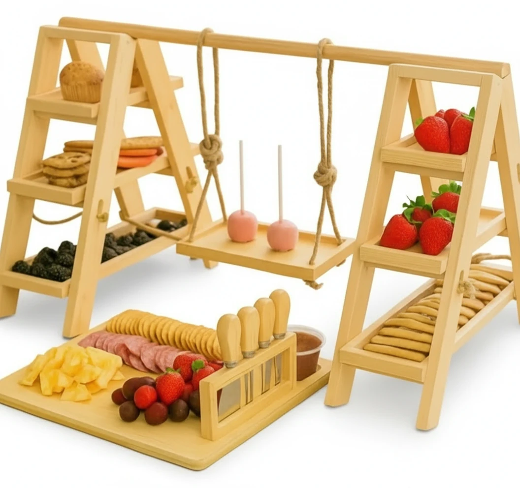 استند چندمنظوره دستساز با چوب طبیعی؛ مناسب سرو میوه، آجیل، دسر، دکور میز مهمانی و چیدمان آشپزخانه. سبک مینیمال و گرم با فینیش طبیعی.